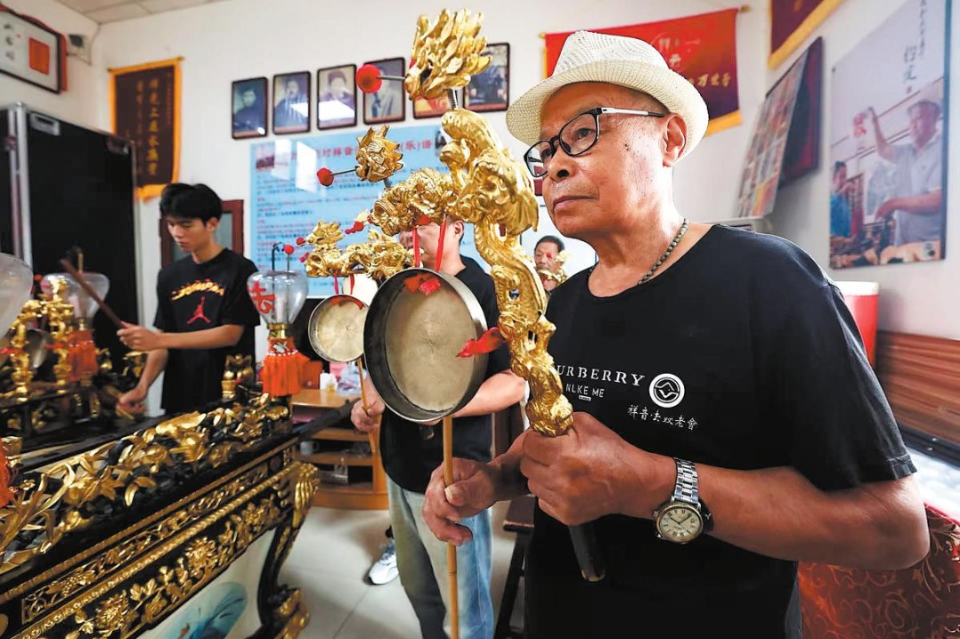 Liu Yuxin (отпред) показва барабанна рутина Liuyuan Xiangyin Fa (дхарма) в Тиендзин през август. WEI XIAOHAO/КИТАЙ ДЕЙЛИ
