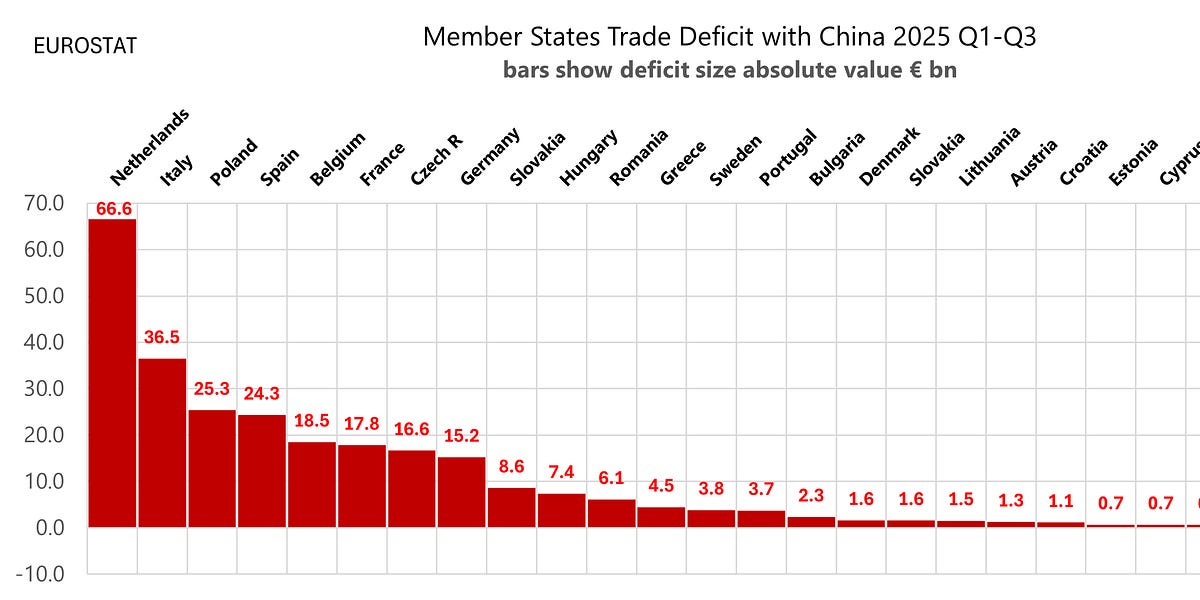 В доктрина за икономическа сигурност, която ще бъде представена на 3 декември, Европейската комисия ще преоцени своя арсенал за търговска защита и ще реши дали са необходими по-строги мерки за справяне с Китай. По време на посещението на германския вицеканцлер Ларс Клингбайл китайската пропаганда се върна към обичайния си разказ, подчертавайки, че търговията между Германия и Китай е по-голяма от търговията между Германия и САЩ, като същевременно удобно игнорира търговския баланс.