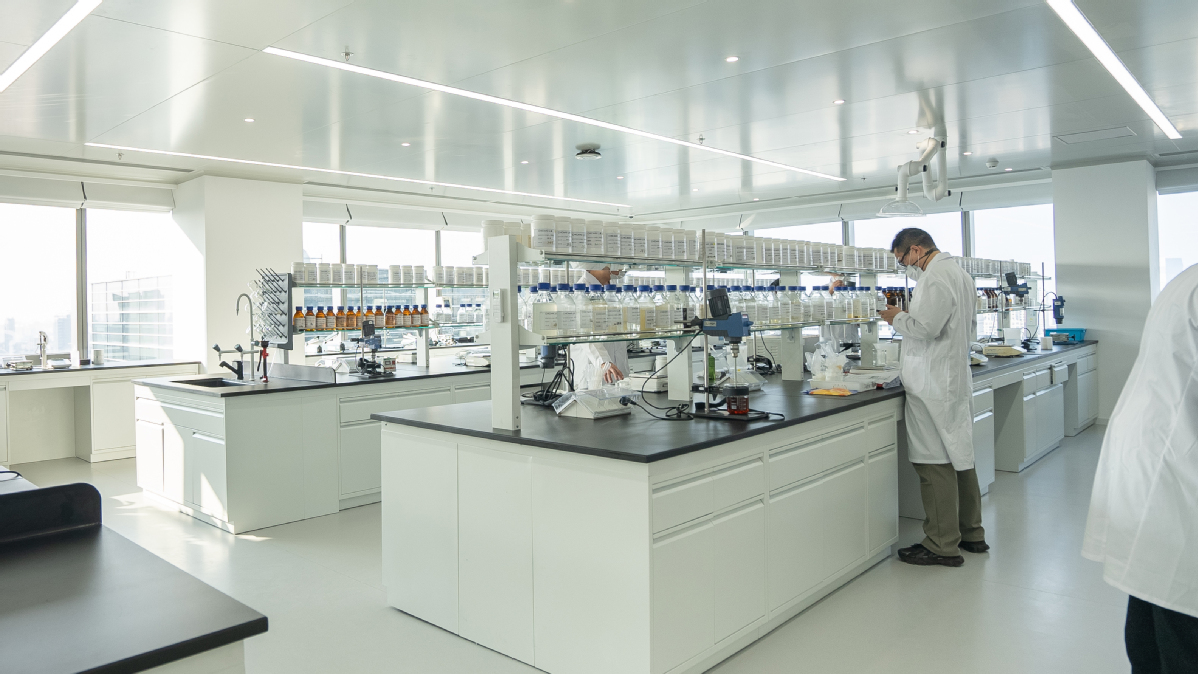 Изследователи работят върху козметична формула в центъра за изследване и развитие на Kans в Шанхай през 2025 г. [Photo provided to chinadaily.com.cn]