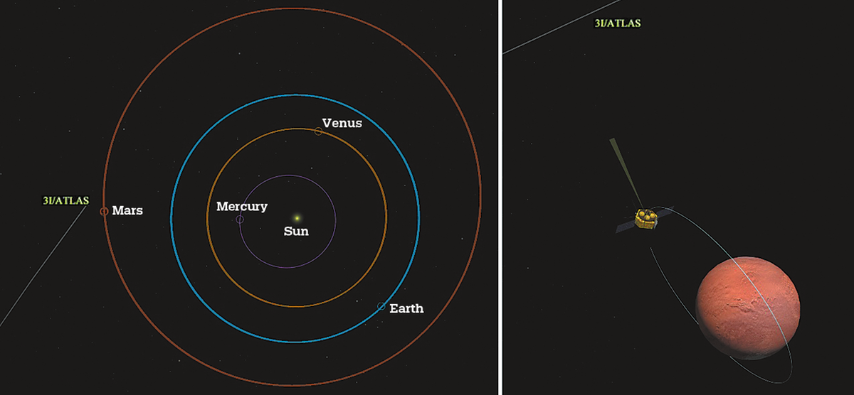 Комбинираната диаграма илюстрира относителните позиции на междузвездния обект 3I/ATLAS и орбитата на китайската мисия на Марс Tianwen 1. Диаграмата вдясно е уголемен участък от диаграмата вляво. КИТАЙСКА НАЦИОНАЛНА КОСМИЧЕСКА АДМИНИСТРАЦИЯ