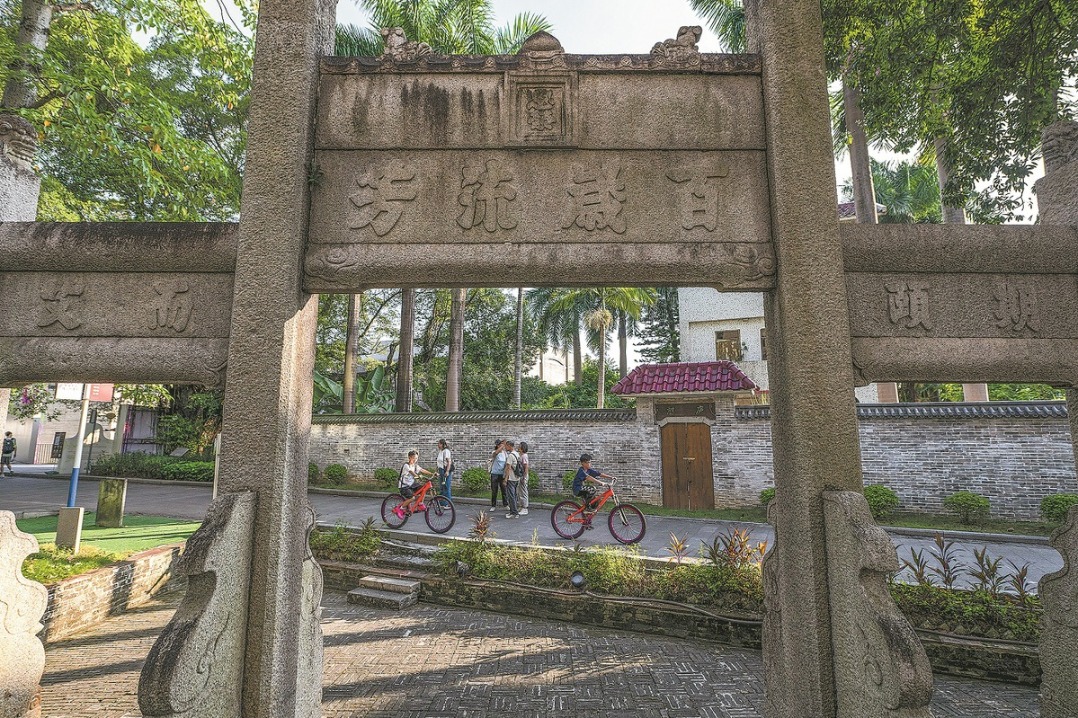 Деца карат педала покрай арката Shengping Renrui, традиционна китайска врата, построена в чест на столетниците по време на династията Цин (1644-1911) в село Langtou, 13 септември. XIAO ENNAN/XINHUA