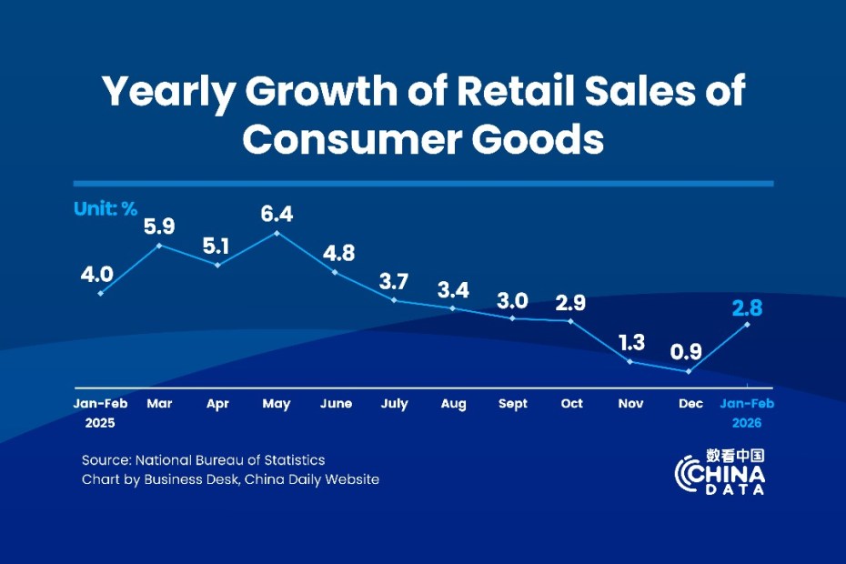 ПЕКИН — Продажбите на дребно на потребителски стоки в Китай са нараснали с 2,8% на годишна база през първите два месеца на 2026 г., показват данни на Националното статистическо бюро (NBS) в понеделник.