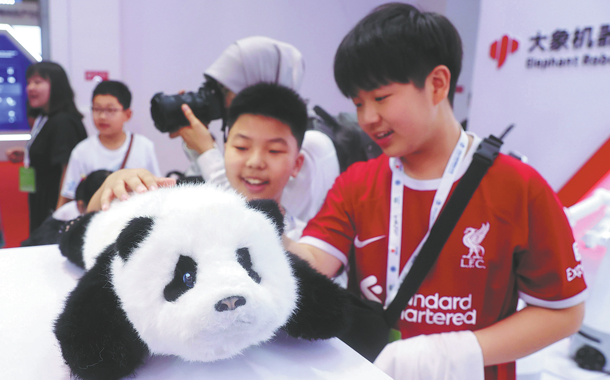 Млади посетители галят робот-компаньон с форма на панда на Световната конференция за роботи през 2024 г. в Пекин на 21 август миналата година. CHEN XIAOGEN/ЗА КИТАЙ ДАЙЛИ