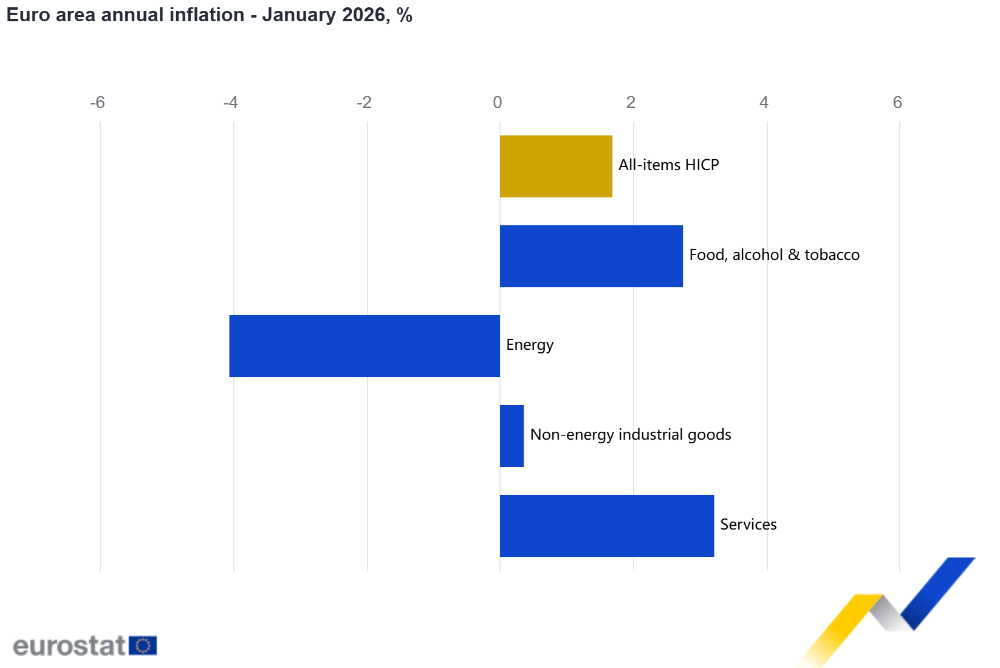 Euro area annual inflation is expected to be 1.7% in January 2026, down from 2.0% in December according to a flash estimate from Eurostat, the statistical office of the European Union.